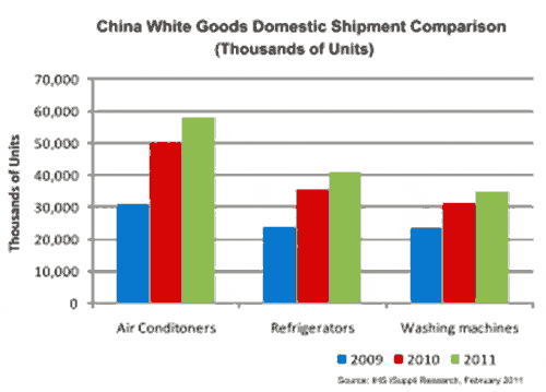 【產(chǎn)通社,3月4日訊】中國政府2010年旨在刺激本地消費(fèi)的補(bǔ)貼計(jì)劃,非常成功地刺激了中國白色家電市場(chǎng)。據(jù)IHS iSuppli公司的研究,2011年繼續(xù)實(shí)施補(bǔ)貼計(jì)劃將推動(dòng)白色家電市場(chǎng)進(jìn)一步增長(zhǎng)。因此,中國政府補(bǔ)貼今年將為領(lǐng)先的白色家電OEM廠商創(chuàng)造更多的改善利潤機(jī)會(huì),就像2010年一樣。