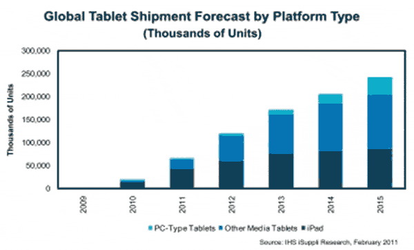 2010-2015年平板市場的驚人增長,將分為三個連續(xù)的增長浪。第一浪是2010和2011年,由iPad及隨之出現(xiàn)的狂熱需求掀起。第二浪將在2011和2012年到來,將由iPad的競爭者掀起,尤其是基于Android的產(chǎn)品。第三浪將在2013年出現(xiàn),將由眾多基于Windows操作系統(tǒng)的產(chǎn)品掀起。Windows操作系統(tǒng)將把平板擴展到傳統(tǒng)的電腦市場。