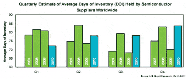 截止到2010年第四季度結(jié)束的時候,半導(dǎo)體供應(yīng)商的庫存天數(shù)(DOI)是83.6天,比第三季度的78.1天增加5.5天或7%。這創(chuàng)下了2008年第二季度以來的最高水平,當(dāng)時的DOI是84天,后來不久半導(dǎo)體產(chǎn)業(yè)就開始下滑。