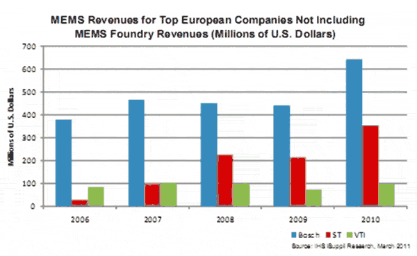 IHS公司估計(jì),意法半導(dǎo)體的MEMS傳感器營(yíng)業(yè)收入——不包括面向噴墨打印機(jī)的代工業(yè)務(wù),2010年超過(guò)3.53億美元,比2009年的2.16億美元大增63%。