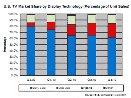LED背光電視亮度更高、更加省電而且更薄,但也比CCFL電視更貴,這可以解釋二者的市場份額差異。但是,LED電視份額增長,鞏固了其2009年第二季度首次亮相以來穩(wěn)步增強的市場地位。2009年第四季度,LED電視只占6%,不到最新數(shù)據(jù)所顯示的四分之一。