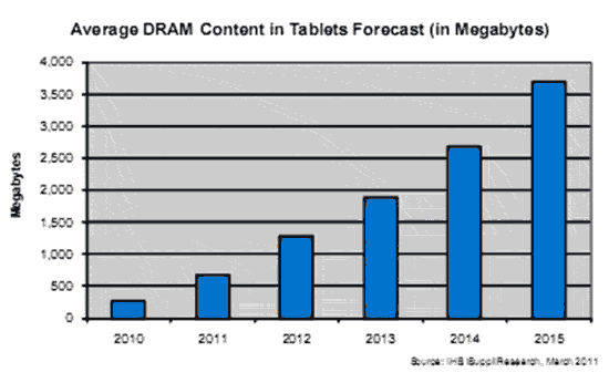 【產(chǎn)通社,3月25日訊】據(jù)IHS iSuppli公司的研究,2011年平板電腦中的DRAM將增長147%,平均達(dá)到676MB。