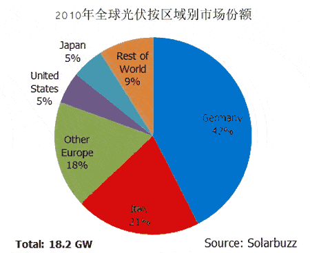 2010年,全球前五大光伏市場(chǎng)國(guó)家為德國(guó)、意大利、捷克共和國(guó)、日本與美國(guó),這五個(gè)國(guó)家占據(jù)了全球80%的需求。其中歐洲地區(qū)光伏市場(chǎng)規(guī)模為14.7GW,占據(jù)全球81%的需求。歐洲區(qū)域前三大光伏市場(chǎng)國(guó)家依序?yàn)榈聡?guó)、意大利與捷克共和國(guó),此三國(guó)家市場(chǎng)規(guī)模共計(jì)12.9GW。2010年日本與美國(guó)市場(chǎng)的增長(zhǎng)非常迅速,年成長(zhǎng)分別達(dá)到101%與96%?傮w來說,2010年超過100個(gè)國(guó)家為光伏產(chǎn)業(yè)需求的迅猛增長(zhǎng)做出了貢獻(xiàn)。