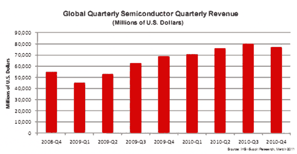 盡管第四季度收縮,但2010年半導體銷售額增長745億美元,刷新了增幅紀錄,超過了2000年網絡泡沫期間創(chuàng)出的592億美元增幅。該產業(yè)的最高年度百分比增長率紀錄仍然是36.7%,這是2000年創(chuàng)下的。
