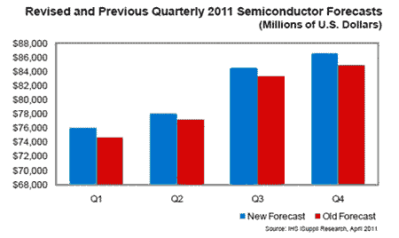 【產(chǎn)通社,4月14日訊】IHS iSuppli公司的研究顯示,日本地震和海嘯導(dǎo)致供應(yīng)中斷并推高主要存儲器件的價格,將使2011年全球半導(dǎo)體銷售額高于先前的預(yù)測。預(yù)計今年半導(dǎo)體銷售額增長7.0%,高于2月初預(yù)計的5.8%,F(xiàn)在預(yù)計2011年全球半導(dǎo)體銷售額將達到3252億美元,高于先前預(yù)測的3201億美元。