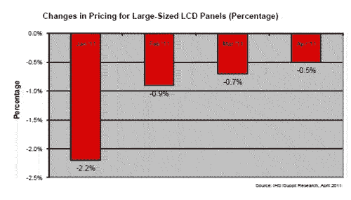 【產(chǎn)通社,4月14日訊】據(jù)IHS iSuppli公司的研究,4月份大尺寸液晶面板的價(jià)格降幅預(yù)計(jì)小于1%,日本地震與海嘯對(duì)其影響顯然不大。從電視、監(jiān)視器和筆記本電腦這三大應(yīng)用領(lǐng)域來看,4月整體液晶面板價(jià)格將比3月下降0.5%。這將是幾個(gè)月以來的最小降幅,顯示面板供應(yīng)商不愿進(jìn)一步降價(jià),尤其是在一年中這個(gè)被視為銷售淡季的時(shí)候。