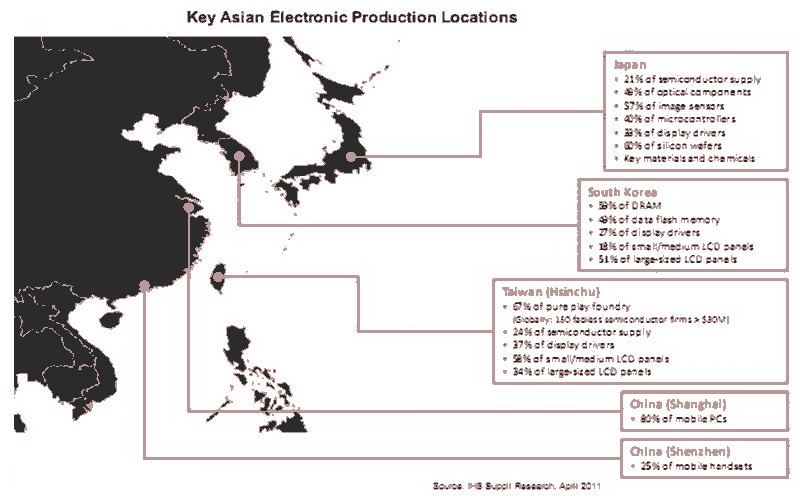 【產(chǎn)通社,4月21日訊】IHS iSuppli公司的研究顯示,日本地震對全球電子供應(yīng)鏈的嚴重破壞,也可能在其它亞洲地區(qū)重現(xiàn),因為科技產(chǎn)業(yè)在一些國家和地區(qū)高度集中。
