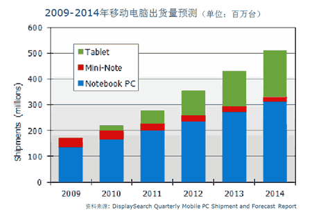 隨著平板電腦市場的起飛和商用計算機市場更替周期的到來,成熟市場移動電腦出貨量有望于中短期內上升。北美出貨量預計將于2011年達到9千1百萬臺,2012年達到1億860萬臺。