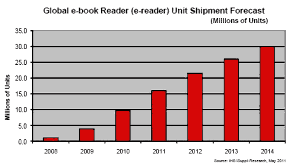 據(jù)IHS iSuppli公司的研究,2010-2014年預(yù)計電子書閱讀器出貨量將增長兩倍以上。2014年全球電子書閱讀器出貨量將從2010年的970萬個增至3000萬個。