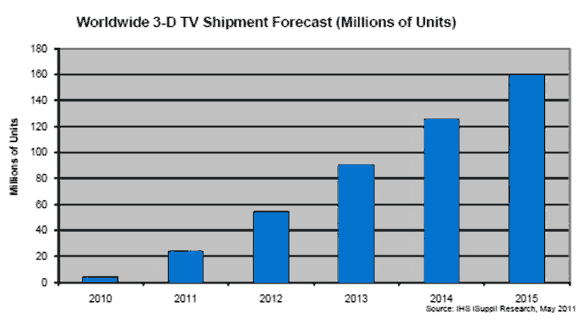 3D電視占全球平板電視市場(chǎng)的份額將在未來(lái)幾年繼續(xù)上升,2011年份額將從去年的2%跳增至11%,明年將達(dá)到22%。到2015年,3D電視將占平板電視出貨量的52%。