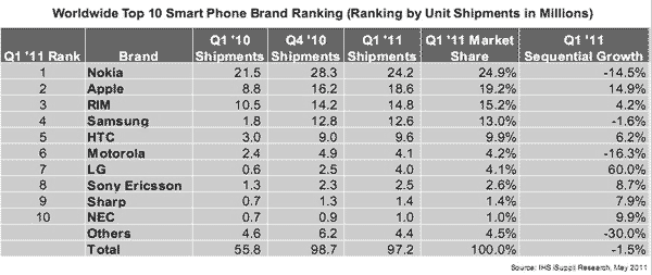 IHS iSuppli:第一季智能手機(jī)市場(chǎng)出現(xiàn)罕見的下滑