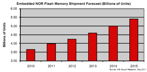 與日漸萎縮的面向手機的無線NOR領域不同,嵌入NOR市場保持穩(wěn)步增長。今年NOR閃存芯片出貨量將超過2010年的36.4億個,未來四年平均每年增長7-9%。到2015年,嵌入NOR出貨量將達到54.1億個左右。