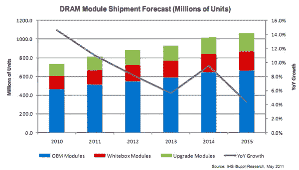 今年63%的DRAM模組,或相當(dāng)于5.104億個(gè),將來自三星電子等OEM廠商。這些OEM廠商不僅為自己的產(chǎn)品生產(chǎn)DRAM模組,而且向其它電腦廠商出售。第二大應(yīng)用占19%,相當(dāng)于1.55億個(gè),將是第三方供應(yīng)商生產(chǎn)的白牌DRAM模組,這些產(chǎn)品賣向戴爾等廠商,然后集成到電腦等產(chǎn)品之中。2011年其它的18%的DRAM模組市場(chǎng),相當(dāng)于1.473億個(gè),將來自升級(jí)模組,也是由第三方供應(yīng)商銷售給零售渠道。