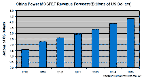 2010-2015年中國功率MOSFET市場的總體復合年度增長率將為13.7%。查詢進一步信息,請訪問http://www.isuppli.com/China-Electronics-Supply-Chain/Pages/Products.aspx。