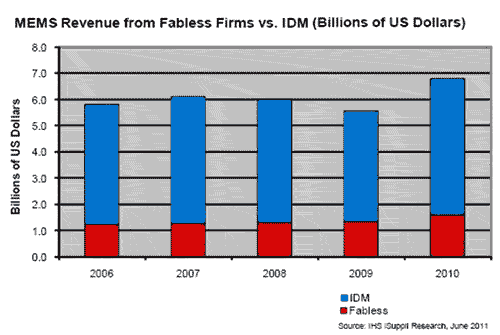 【產(chǎn)通社,6月23日訊】據(jù)IHS iSuppli公司的研究,2010年無(wú)晶圓制造半導(dǎo)體公司擴(kuò)大了在全球微機(jī)電系統(tǒng)(MEMS)市場(chǎng)的份額,去年占總體MEMS營(yíng)業(yè)收入的近四分之一。2010年無(wú)晶圓制造半導(dǎo)體公司占總體MEMS營(yíng)業(yè)收入的23.2%,高于四年前的21.3%。這四年的增幅雖然不大,但卻表明MEMS制造業(yè)務(wù)不再由集成器件制造商(IDM)所獨(dú)占,繼續(xù)流向其它廠商。IDM在自己內(nèi)部設(shè)計(jì)和生產(chǎn)產(chǎn)品;相反,無(wú)晶圓制造半導(dǎo)體公司,沒(méi)有自己的工廠,而是把生產(chǎn)業(yè)務(wù)外包給其它專(zhuān)業(yè)制造商——代工廠商。