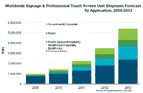 互動顯示器在數(shù)字標牌與專業(yè)領(lǐng)域也日益突出,在這些應(yīng)用中平板顯示器更為常見。IHS iSuppli公司預(yù)測,2013年零售和休閑/保健領(lǐng)域的平板互動顯示器出貨量將超過120萬個,在標牌、教育與專業(yè)顯示器市場占40%的份額。