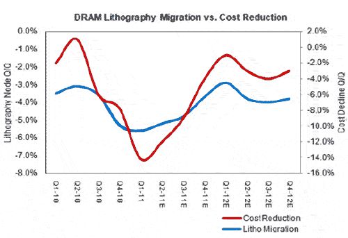 IHS iSuppli公司的研究顯示,但從第二季度開始,預(yù)計(jì)DRAM產(chǎn)業(yè)對于光刻工藝遷移的態(tài)度將不再那么積極,成本下降速度也將變慢。第二季度lithography reduction將下降到5.2%,第三季度下降到4.8%,第四季度降到3.7%。相應(yīng)地,成本削減幅度也將在第二季度下降到12%,第三和第四季度分別降至9和4%。