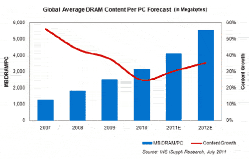 【產(chǎn)通社,7月21日訊】據(jù)IHS iSuppli公司的內(nèi)存與存儲(chǔ)報(bào)告,個(gè)人電腦(PC)中的DRAM含量增長速度將出現(xiàn)歷史性的下降,2012年以后每臺(tái)新PC中的DRAM含量的平均年度增長速度將不會(huì)超過35%,低于最近25年48%的平均水平。繼2009和2010年分別增長38%和25%之后,2011和2012年每臺(tái)PC中的平均DRAM含量將分別增長30%和35%。但是,2012年增速將達(dá)到高點(diǎn),隨后幾年的增長速度預(yù)計(jì)將明顯低于35%。相比之下,1985-2009年的復(fù)合年度增長率為48%,而21世紀(jì)最初幾年的增長速度更是高達(dá)40-45%。