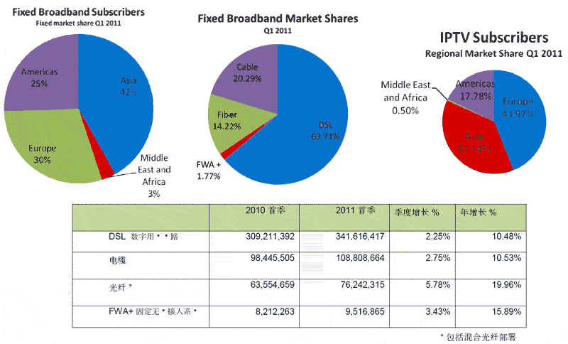 亞洲的強(qiáng)勁增長(zhǎng)在很大程度上是由于寬帶在中國(guó)地區(qū)的持續(xù)成功。在2011年首三個(gè)月,全球?qū)拵в啈舻膬粼鰯?shù)量有42%來自中國(guó)和其領(lǐng)土地區(qū)(香港特別行政區(qū)和澳門)。