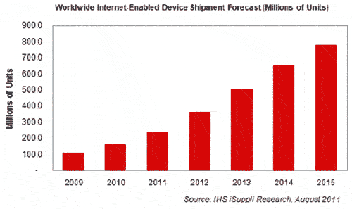 兩年前媒體平板出貨量還微不足道,但它將成為增長最快的網(wǎng)絡(luò)驅(qū)動設(shè)備,2015年出貨量將超過3億個,是2010年的15倍,五年復(fù)合年度增長率高達73.3%。未來四年,其它網(wǎng)絡(luò)驅(qū)動設(shè)備的增長速度將難以與其比肩。據(jù)IHS iSuppli公司的研究,在該領(lǐng)域以外,2015年只有手機的銷量將會超過媒體平板,而且屆時媒體平板與筆記本電腦和平板電視的競爭將趨于白熱化。