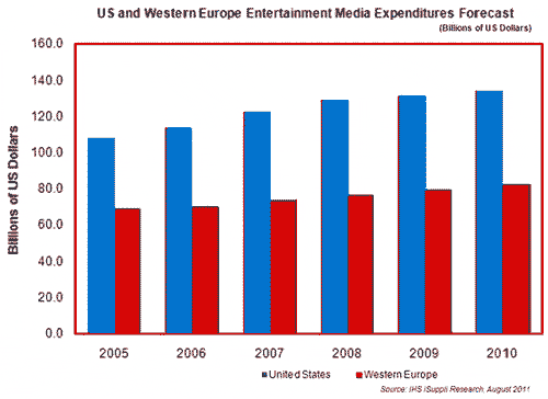 【產(chǎn)通社,8月10日訊】據(jù)IHS公司的Screen Digest TV Intelligence報(bào)告,2010年美國消費(fèi)者的娛樂媒體支出比西歐消費(fèi)者高出63%,但如果把付費(fèi)電視訂閱排除在外,或者把公共電視資助考慮在內(nèi),則二者之間的差距要小得多。