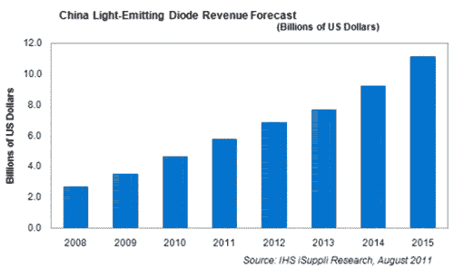 【產(chǎn)通社,8月10日訊】在政府支持下和新應(yīng)用的帶動(dòng)下,2011年中國(guó)LED市場(chǎng)將從去年的47億美元增長(zhǎng)到58億美元,上升23%。由于更加廣泛地用于液晶電視和街道照明,LED已成為中國(guó)制造的熱門產(chǎn)品,而且是很有吸引力的投資領(lǐng)域。另外,政府對(duì)該產(chǎn)業(yè)的支持似乎正在產(chǎn)生效果。預(yù)計(jì)明年中國(guó)LED市場(chǎng)將達(dá)到69億美元,到2015年達(dá)到111億美元,2010-2015年的復(fù)合年度增長(zhǎng)率為17.7%。