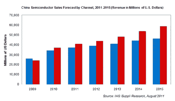 預(yù)計(jì)將來(lái)會(huì)保持這種趨勢(shì)。2010-2015年分銷商的半導(dǎo)體銷售額的復(fù)合年度增長(zhǎng)率將達(dá)6.1%,而同期直銷的增長(zhǎng)率將為9.6%。因此,2015年分銷商占總體半導(dǎo)體銷售額的比例將從2011年的47.5%降到44%。