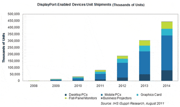 IHS iSuppli公司預(yù)計(jì), 2014年DisplayPort設(shè)備的全球出貨量將從2010年的3100萬(wàn)個(gè)增長(zhǎng)到4.45億個(gè)以上。未來(lái)四年,多數(shù)OEM廠商和所有個(gè)人電腦CPU以及圖形處理單元(GPU)廠商將逐漸停止支持VGA連接器,DisplayPort在臺(tái)式電腦和移動(dòng)PC市場(chǎng)的份額將迅速上升,這是其增長(zhǎng)的主要?jiǎng)恿Α?BR>