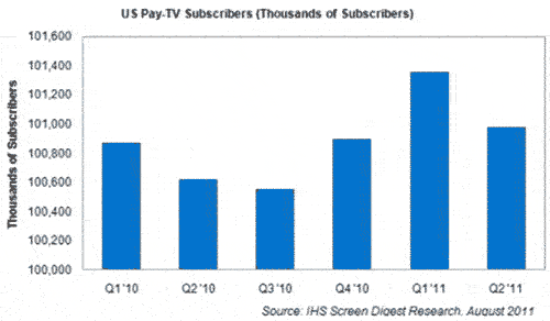 【產(chǎn)通社,8月30日訊】據(jù)IHS Screen Digest,由于經(jīng)濟因素和價格較低的互聯(lián)網(wǎng)視頻解決方案的影響,傳統(tǒng)有線及衛(wèi)星視頻提供商的訂戶持續(xù)流失,第二季度美國付費電視家庭數(shù)量下降了將近38萬個。第二季度總體美國電視訂戶從第一季度的1.014億個減少至1.009億個。這些數(shù)字包含三個付費電視領(lǐng)域的訂戶:有線,衛(wèi)星和網(wǎng)絡(luò)電視(IPTV)。