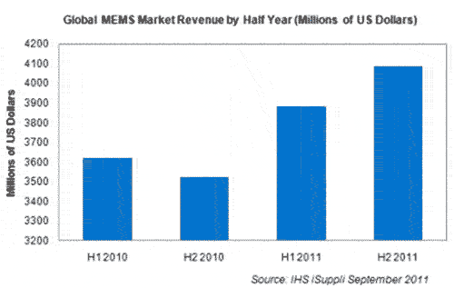 IHS公司認(rèn)為,盡管目前經(jīng)濟(jì)形勢(shì)動(dòng)蕩,但2011年消費(fèi)與移動(dòng)MEMS市場(chǎng)將實(shí)現(xiàn)37%的增長(zhǎng)率。