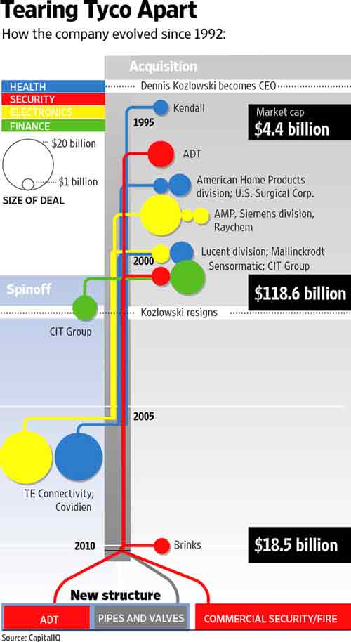 2007年,泰科國際從一家年度營收410億美元的龐大的企業(yè)集團(tuán)分拆為三家獨立的公開上市公司:Covidien健康護(hù)理業(yè)務(wù)、泰科電子(TE Connectivity)業(yè)務(wù),保留了火災(zāi)、安全及工程產(chǎn)品業(yè)務(wù)。本次分拆是對保留業(yè)務(wù)的二次分拆。