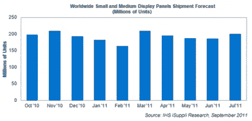 7月中小顯示器面板出貨量從6月的1.865億個(gè)增長(zhǎng)到2.003億個(gè)。7月扭轉(zhuǎn)了3月以來(lái)出貨量持續(xù)下降的勢(shì)頭,在2010年11月出貨量突破2億大關(guān)以來(lái)的八個(gè)月中,這只是第二次出現(xiàn)增長(zhǎng)。今年第二季度中小顯示器面板的出貨量比2010年同期高出11%,而且預(yù)計(jì)今年第三和第四季度將強(qiáng)勁增長(zhǎng)?傮w來(lái)看,2011年下半年手機(jī)出貨量預(yù)計(jì)為5.28億部,智能電話出貨量為2.65億部,全年平板電視出貨量約為6000萬(wàn)個(gè)。這將推動(dòng)對(duì)中小顯示器面板的需求。