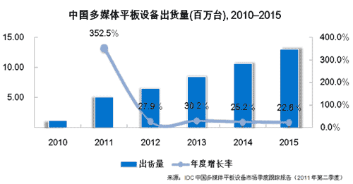 IDC最新預(yù)測數(shù)據(jù)顯示,中國多媒體平板設(shè)備市場2011年度出貨量有望達(dá)到510萬臺,銷售額則將達(dá)到27.3億美元。到2015年,這一市場規(guī)模將突破1300萬臺,銷售額則有望突破67億美元。