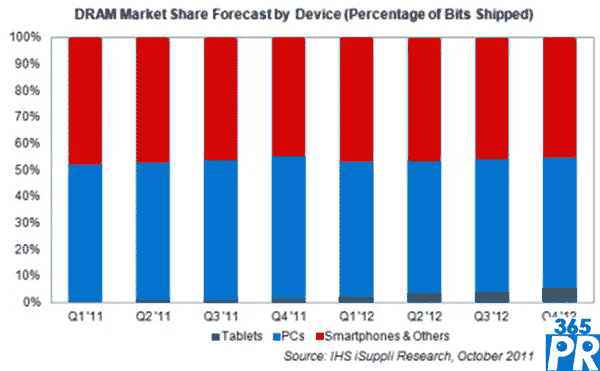 第三季度,平板電腦DRAM的市場份額是1.1%,而第一和第二季度分別只有0.5%和1.0%。盡管份額很小,但未來幾個季度將繼續(xù)上升,今年第四季度將增長近一倍,達到2.1%。到2012年第四季度,平板電腦DRAM所占份額將升至4.9%,相當于從2011年初開始的短短八個季度劇增了1703%。