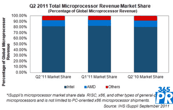英特爾第二季度占全球微處理器營(yíng)業(yè)收入的81.8%,比2010年第二季度時(shí)的80.7%提高了1.1個(gè)百分點(diǎn)。英特爾的頭號(hào)對(duì)手AMD同期市場(chǎng)份額卻下降了1.1個(gè)百分點(diǎn)。第二季度英特爾受益于PC需求回升,以及Sandy Bridge系列微處理器出貨量強(qiáng)勁增長(zhǎng)。企業(yè)PC銷售旺盛,尤其對(duì)英特爾有利,企業(yè)計(jì)算領(lǐng)域的表現(xiàn)一直好于消費(fèi)市場(chǎng)。