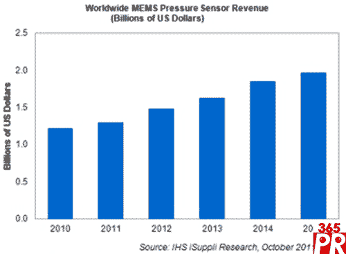 到2015年,MEMS壓力傳感器銷售額將達到19.7億美元,2010-2015年的復合年度增長率為10%。