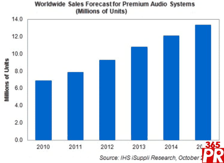 2011年全球高檔音響系統(tǒng)銷量將達(dá)到79億個,比去年的69億勁增14%,到2015年將達(dá)到133億個左右。今年該市場全球銷售額將達(dá)到73億美元,比2010年的66億美元增長11%。預(yù)計(jì)未來三年高檔音響出貨量將保持12-18%的增長速度。高檔音響是指具有以下任何一種或全部特點(diǎn)的系統(tǒng):環(huán)繞聲,八個或更多的喇叭,400W或更高的功率。