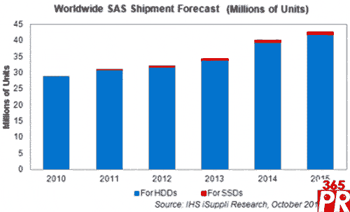2011年SAS在企業(yè)硬盤領(lǐng)域的出貨量預(yù)計(jì)達(dá)到3080萬個(gè),比 2010年的2880萬增長7%。相比之下,今年企業(yè)SSD領(lǐng)域的SAS出貨量要小得多,預(yù)計(jì)為30萬個(gè),但其增長率高達(dá)三位數(shù),去年出貨量只有10萬個(gè)。