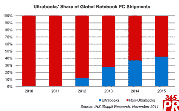 【產(chǎn)通社,11月22日訊】據(jù)IHS iSuppli公司計(jì)算平臺(tái)部門的研究報(bào)告,為了抵擋媒體平板日益增強(qiáng)的威脅,移動(dòng)PC市場(chǎng)正在力推新型超級(jí)本平臺(tái),預(yù)計(jì)其出貨量到2015年將占到整體筆記本市場(chǎng)的40%以上。2015年,超級(jí)本將占全球筆記本電腦出貨量的43%,而2011和2012年分別是2%和13%。繼2011年首次出貨之后,超級(jí)本占筆記本市場(chǎng)的份額將快速上升,2013年上升到28%,2014年上升到38%。