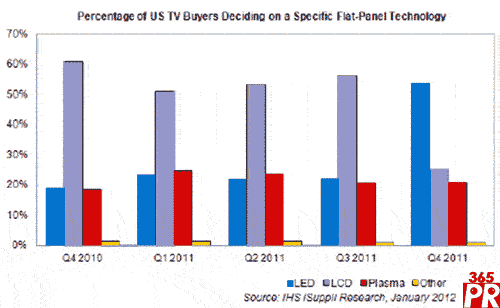 第四季度等離子電視的汰換率也在下降,只有11%的等離子電視被新的等離子電視替換,低于第三季度時(shí)的21%。這更加表明消費(fèi)者對(duì)于等離子技術(shù)的忠誠(chéng)度繼續(xù)下降。