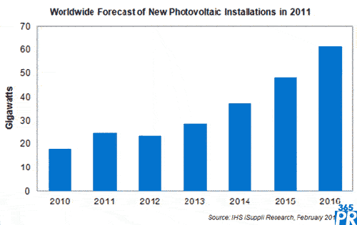 2010年全球光伏市場劇增146%。但今年將結(jié)束快速增長的勢頭,預(yù)計今年太陽能安裝將下降6%至23.3GW。由于面臨預(yù)算困難和政治壓力,許多國家的政府預(yù)計會削減上網(wǎng)電價補(bǔ)貼和減少對光伏產(chǎn)業(yè)的支持,這將削減建造商和投資者的熱情。但2012年以后,光伏產(chǎn)業(yè)仍具有可觀的潛力,在新興地區(qū)繼續(xù)增長,2016年全球新安裝容量預(yù)計將升到61.3GW。