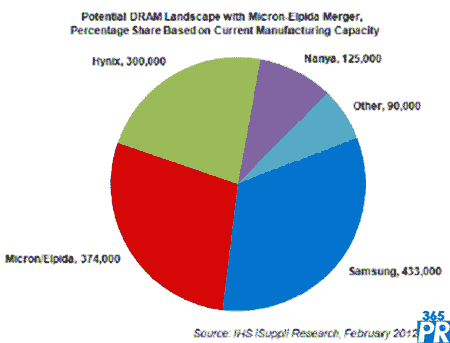 IHS公司認為,美光與爾必達合并將形成三星最強大的競爭對手。三星電子通常領先于最近它的對手10個百分點,但這次合并將把三星市場份額的領先優(yōu)勢削弱一半至5個百分點。