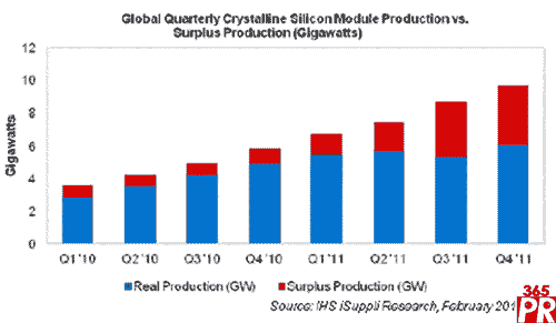 2011年光伏供應(yīng)商的過(guò)剩產(chǎn)能達(dá)到9.96GW,比2010年的3.01GW劇增231%。去年的實(shí)際需求為22.7GW,高于2010年的15.7GW。在過(guò)去兩年的八個(gè)季度中,其中有六個(gè)季度過(guò)剩產(chǎn)能穩(wěn)步上升,2011年第三季度增幅最大。當(dāng)時(shí),過(guò)剩產(chǎn)能達(dá)到3.28GW,比第二季度的1.82GW激增了80%。