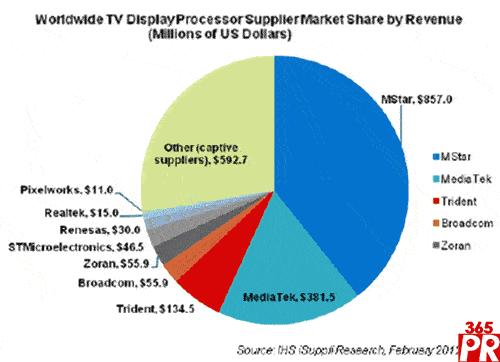【產(chǎn)通社,2月29日訊】據(jù)IHS iSuppli公司的顯示電子專題報(bào)告,憑借與中國大陸廠商的緊密關(guān)系和清晰的產(chǎn)品策略,臺(tái)灣半導(dǎo)體芯片供應(yīng)商晨星與聯(lián)發(fā)科2011年幾乎完全統(tǒng)治了電視視頻處理器市場,而包括英特爾在內(nèi)的幾家廠商則認(rèn)負(fù)出局。
