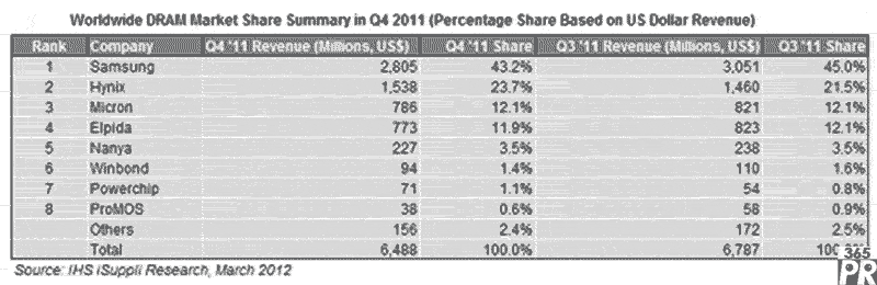 其它DRAM廠商的市場(chǎng)份額大致保持不變,或者有所下降。例如,三星電子第四季度仍然是最大的DRAM廠商。但其市場(chǎng)份額降至43.2%,營(yíng)業(yè)收入為28億美元,第三季度分別是45.0%和31億美元。由于向30納米制程的遷移速度慢于預(yù)期,該公司出貨量增幅低于產(chǎn)業(yè)整體水平,導(dǎo)致其市場(chǎng)份額下降。