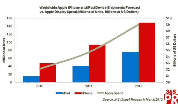 【產(chǎn)通社,3月8日訊】據(jù)IHS iSuppli公司的研究報告,由于預(yù)計iPhone和iPad產(chǎn)品出貨量今年大幅增長,蘋果2012年可能在這兩款產(chǎn)品的顯示器面板上面支出90億美元,進一步確保其在平板電腦和手機市場中的主導(dǎo)地位。蘋果今年用于顯示器的預(yù)算依據(jù)是,預(yù)計iPhone和iPad的出貨量分別為1.5億和7500萬個。去年的這部分預(yù)算約為47億美元,iPhone與iPad的出貨量分別是9300萬與400萬個。