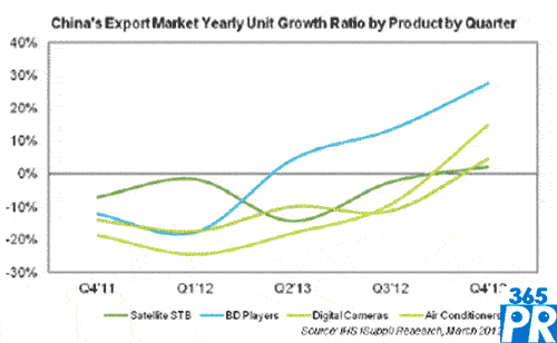 【產(chǎn)通社,3月22日訊】據(jù)IHS iSuppli公司的中國研究報告,全球經(jīng)濟增長速度低于預期將在2012年上半年損及中國消費電子出口市場,衛(wèi)星機頂盒(STB)、藍光光盤(BD)播放器、數(shù)碼相機和空調(diào)銷售將全面下滑。