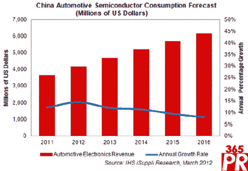 【產(chǎn)通社,3月28日訊】據(jù)IHS iSuppli公司的中國研究服務(wù),隨著中國汽車買家變得更加成熟,他們?nèi)找嬉笃嚫影踩、更加省油和提供更多的駕駛樂趣,這將促使2012年中國汽車半導(dǎo)體銷售額強(qiáng)勁增長14%。