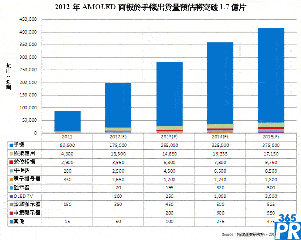 【產(chǎn)通社,4月22日訊】AMOLED面板具省電、輕薄、色彩飽和等優(yōu)點,被業(yè)界視為是下一代顯示器技術(shù)主流,以及提高消費性電子產(chǎn)品附加價值的秘密武器。拓墣產(chǎn)業(yè)研究所柏德葳經(jīng)理指出,由于AMOLED主要應(yīng)用為9吋以下的中小尺寸面板,行動通訊產(chǎn)品將是未來5年全球AMOLED主要成長動能,其中又以智能型手機為大宗。預(yù)估2012年AMOLED面板于手機出貨量將突破1.7億片,和2011年的8,050萬片相較,年成長率高達117%。