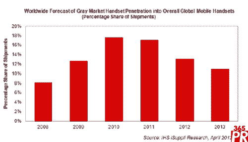 2010和2011年,手機(jī)灰市占總體手機(jī)出貨量的17-18%,高于2009年的8%和2010年的13%。盡管今年灰市手機(jī)的占有率將會(huì)下降,但其占總體手機(jī)市場(chǎng)的份額仍將保持在11%以上的兩位數(shù)。